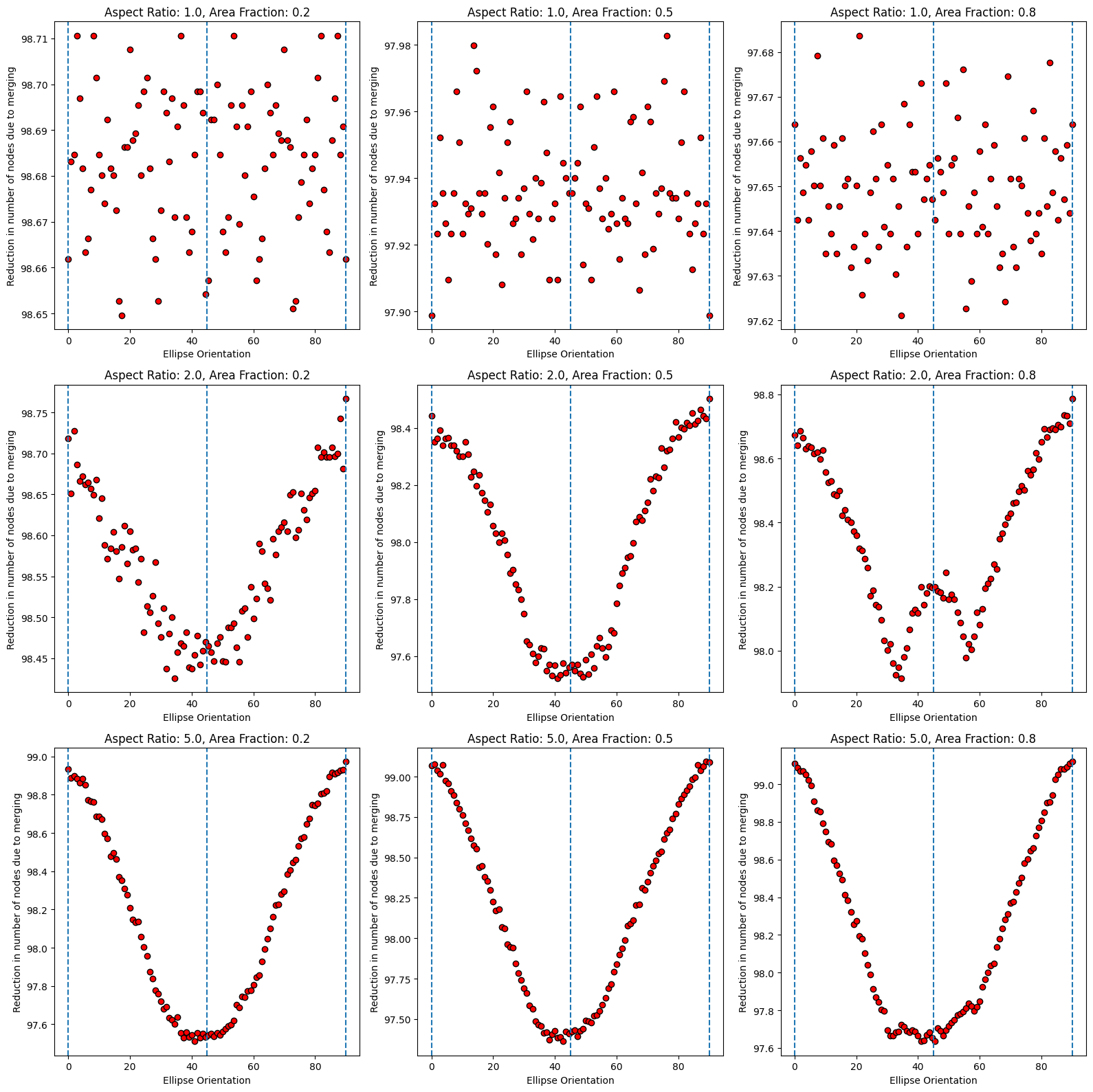 In the above plot, we can see that reduction in nodes is higher at ellipse orientations closer to 0 and 90 degrees, and lower at orientations closer to 45 degrees.